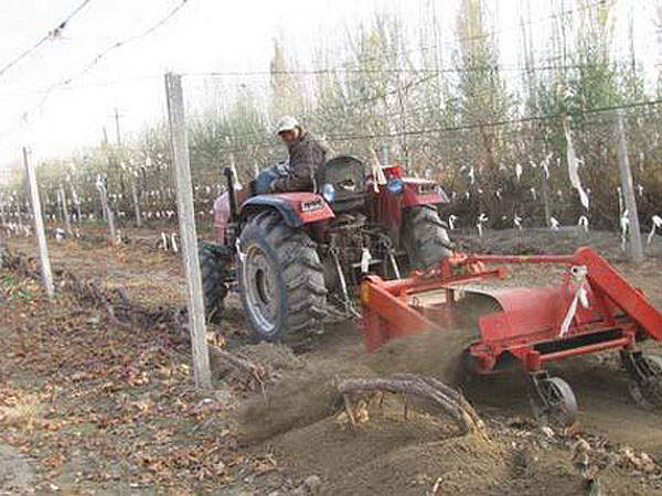 我公司研制的以使用廣泛的手扶拖拉機(jī)為動(dòng)力的新型葡萄埋藤機(jī),操作簡(jiǎn)單,對(duì)各種地塊適應(yīng)性強(qiáng),工作效率高、埋土效果好、不傷根、不傷藤、堆土密、不漏風(fēng)、比人工埋藤效果提高30倍以上,降低了勞動(dòng)強(qiáng)度,節(jié)約勞動(dòng)成本,符合現(xiàn)代農(nóng)業(yè)發(fā)展方向。